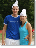 Die acht Teams der diesjährigen Strandball WM hielten, was ihre Namen versprochen hatten. Alles war dabei: neuformierte Teams wie Diana/Lalo (Schlumpfhausen), Julian/Franzi (Schweiz), Lars/Lisa (Entenhausen) und Titelverteidiger Holger mit seiner neuen „Beachpartnerin“ Nadine (Stammpartnerin Caro hatte 2010 eine schöpferische Pause eingelegt. Wir hoffen, sie bald wieder im Sand zu sehen!!) Dazu kamen alt eingesessene Mannschaften wie Koni/Martina (Schlaraffenland), Bene/Christiane (Das unbekannte Land) und Peter/Simone (Wolke 7). Vervollständigt wurde das Teilnehmerfeld vom wieder zusammengefundenen Team Carl/Uschi (Capri). |